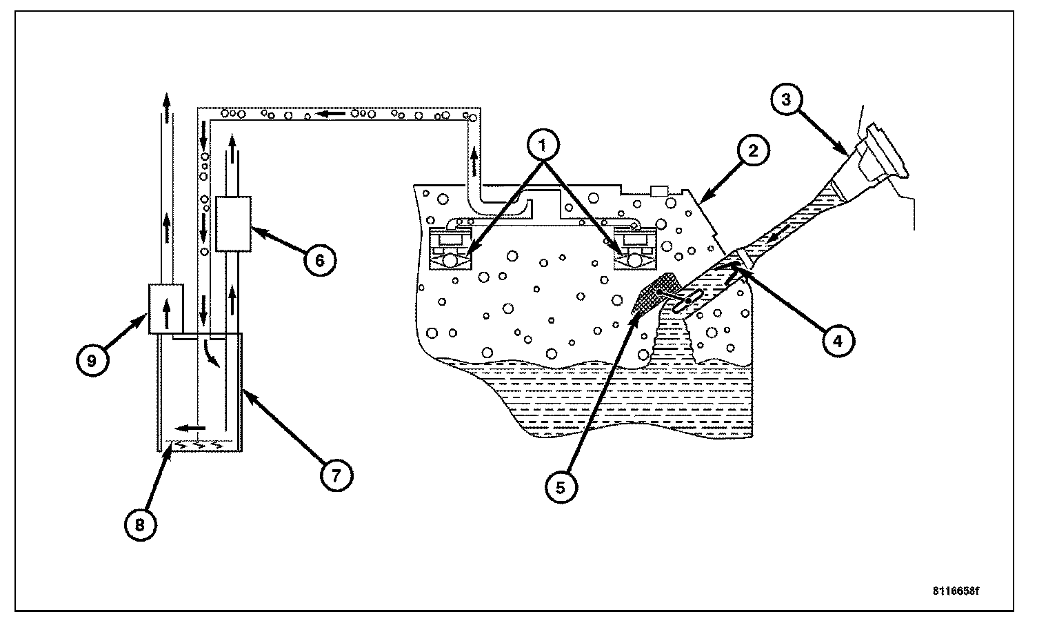 As fuel starts to flow through the Fuel Filler Tube (3), it opens the normally closed Fuel Filler Tube Check Valve (4) and enters the Fuel Tank (2). Vapor or air is expelled from the tank through the tank vent/rollover valves (1) to the EVAP Canister (7). Vapor is absorbed in the canister (7) until vapor flow in the lines stops, either following refueling shut-off or by having the fuel level in the tank rise high enough to close the check valves in the tank vent/rollover valves (1). The fuel filler tube (3) also incorporates a fuel tank overfill check valve (5). As fuel level rises, the fuel tank overfill check valve (5) seals the in-tank end of the fuel filler tube (3). This largely prevents overfilling of the Fuel Tank (2). At this point in the fueling of the vehicle, the tank pressure increases, the fuel filler tube check valve (4) closes (preventing tank fuel from spitting back at the operator), and fuel then rises up the filler tube (3) to shutoff the dispensing nozzle.