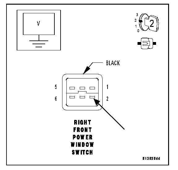 Measure the voltage of the Right Power Window Switch Sense circuit at the Right Front Power Window Switch harness connector.