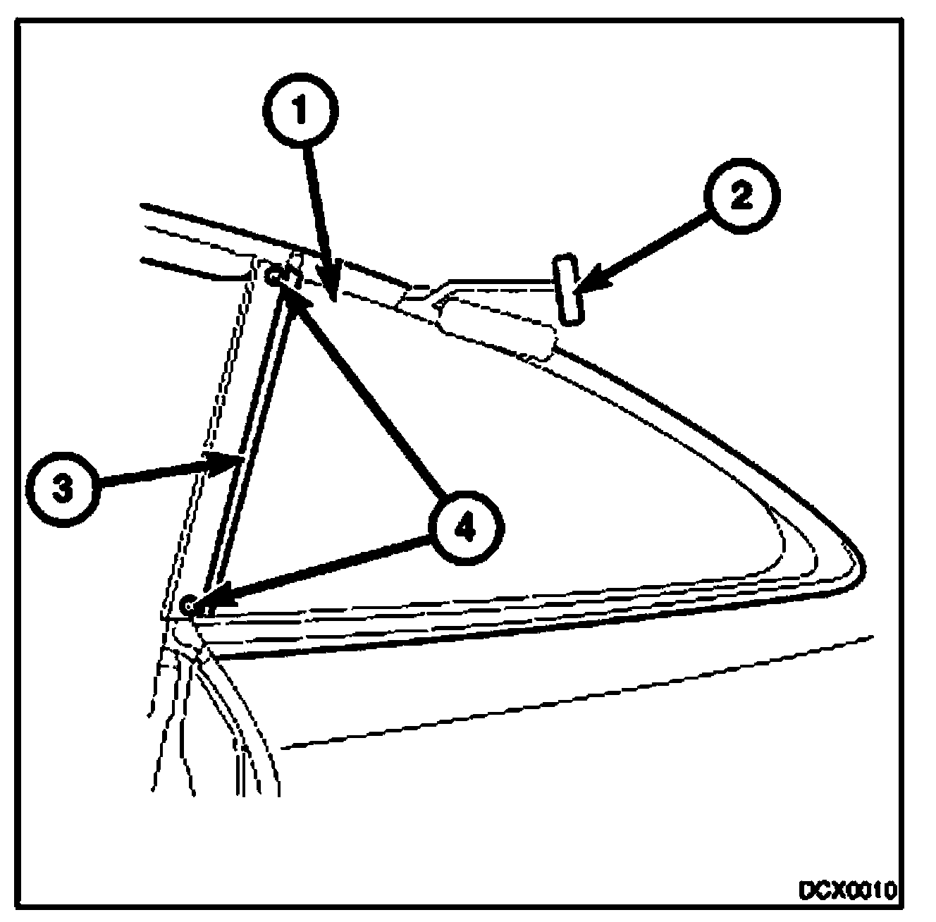 NOTE: The quarter window fence should be cleaned of old urethane bonding material. Support spacers should be cleaned and properly installed on weld studs or repair screws at bottom of quarter window opening.