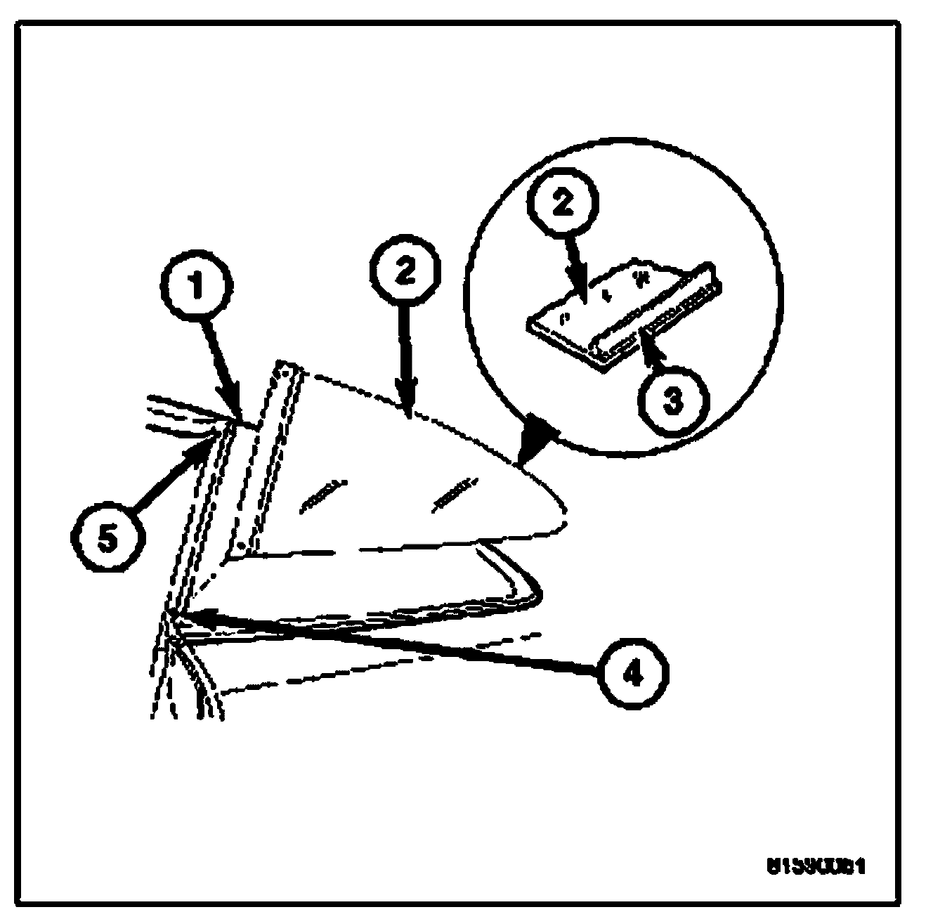 4. Apply a 12 mm (0.5 in.) high by 8 mm (0.3 in.) wide triangular bead of urethane (3) around window edge.