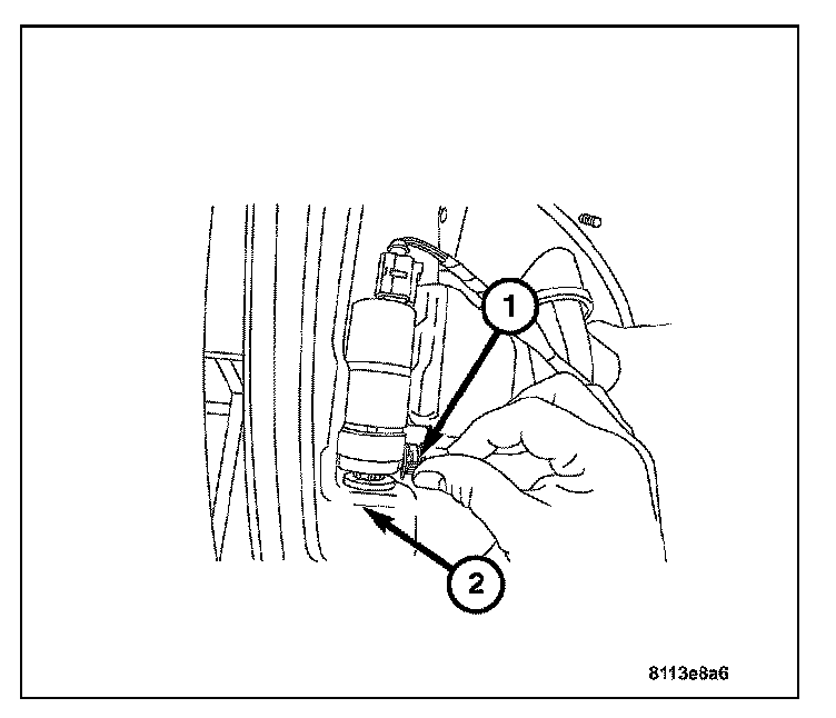 1. Route the washer hose (1) through the cowl opening and attach to the washer pump motor (2). Secure the attachment clamp.