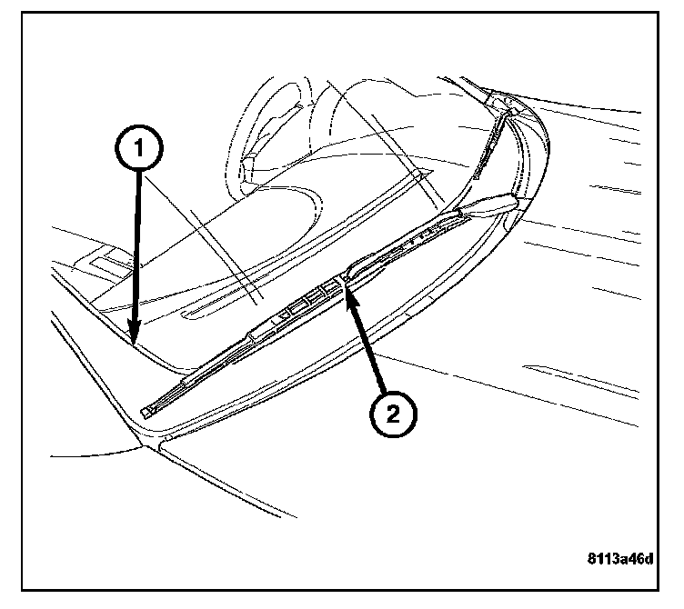 1. Align the wiper module into the cowl over the two upper attachment nut mounting studs (1).