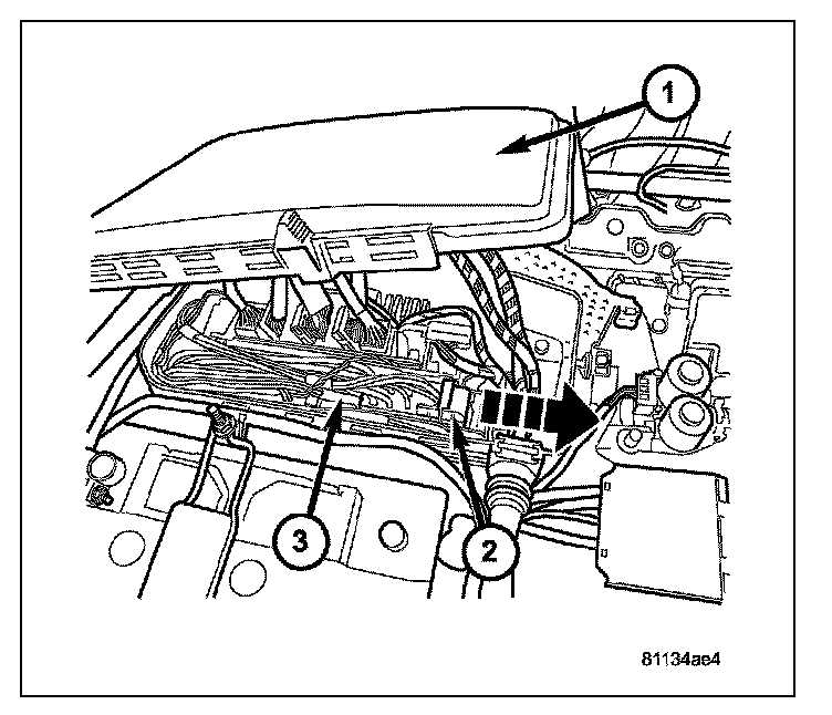 7. Connect the wiper motor harness connector (2) to the Body Control Module (BCM) (3) and slide the locking tab fully over the connector (2).
