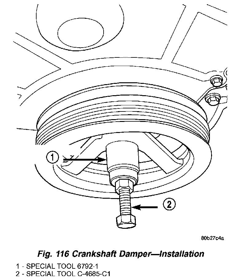 Install crankshaft damper using Special Tools C-4685-C1 (5.9 inch) Bolt, with Nut and Thrust Bearing from 6792, and 6792-1 Installer (Fig. 116).