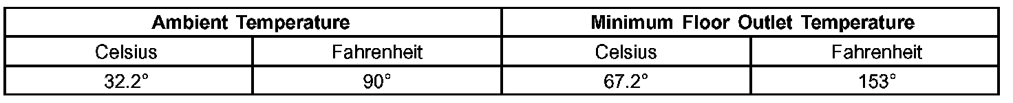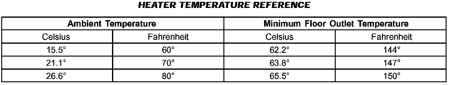 Engine coolant is provided to the heater system by two heater hoses. With the engine idling at normal operating temperature, set the temperature control to maximum heat, the mode control to the floor position, and the blower in the highest speed position. Using a test thermometer, check the temperature of the air being discharged from the floor outlets. Compare the test thermometer reading to the Heater Temperature Reference chart.