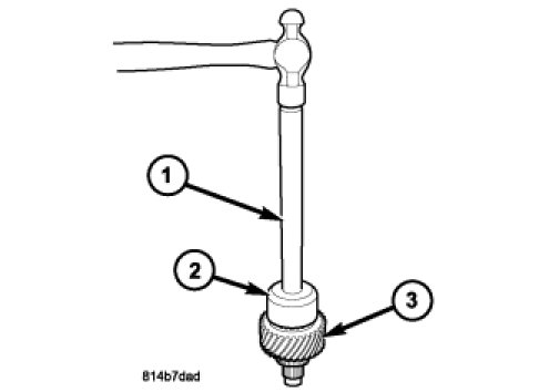 10. Install the front bearing onto the hollow shaft (3) with Handle C-4171 (1) and Installer C-4213 (2).