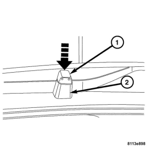 1. Install the washer nozzle (1) into the cowl grille (2). Press downward with a rocking motion until the retaining clip is fully seated.