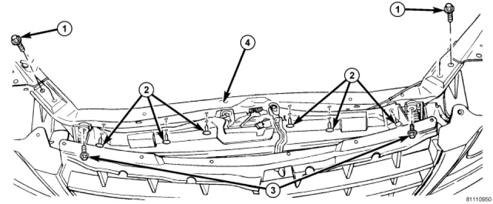 3. Install two bolts on each side of radiator crossmember. Tighten bolts to 17 Nm (150 in. lbs.) torque.
