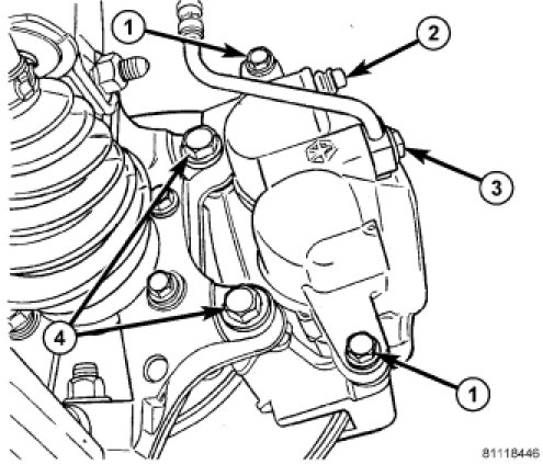 5. Align caliper guide pin bolt holes with guide pins, then install caliper guide pin bolts (4). Tighten upper (closest to bleeder screw) bolt to 43 Nm (32 ft. lbs.), then tighten lower bolt to 43 Nm (32 ft. lbs.).