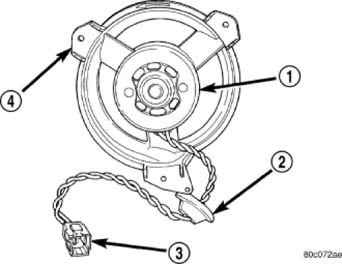 3. Align the blower motor mounting tabs (4) to the locations noted during removal and install the three screws that secure the blower motor to the HVAC housing. Tighten the screws to 2 Nm (17 in. lbs.).