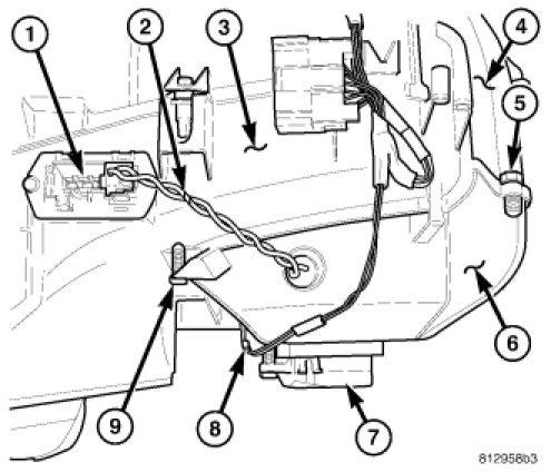 9. Install the recirculation door actuator (7) and connect the wire harness connector (8) to the actuator.
