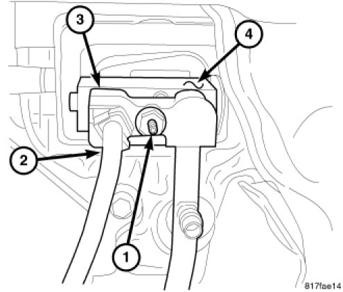 4. Connect the A/C liquid line (2) and A/C suction line (3) to the A/C expansion valve (4) and install the retaining nut (1). Tighten the nut to 23 Nm (17 ft. lbs.).