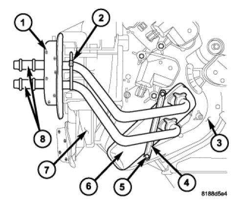 1. Carefully install the heater core (6) into the driver side of the air distribution housing (3) while locating the heater core tubes (8) to the flange.