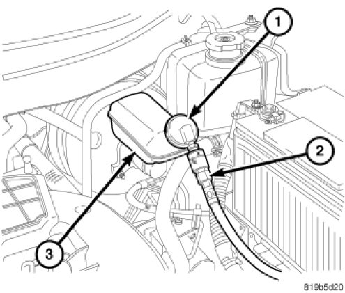 1. Install Master Cylinder Pressure Bleed Cap (1), Special Tool 6921, on the master cylinder fluid reservoir (3). Attach the fluid hose from the pressure bleeder (2) to the fitting on Special Tool 6921.