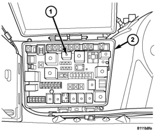 The transmission control relay (1) is located in the Power Distribution Center (PDC) (2), which is located on the left side of the engine compartment between the battery and radiator upper support.