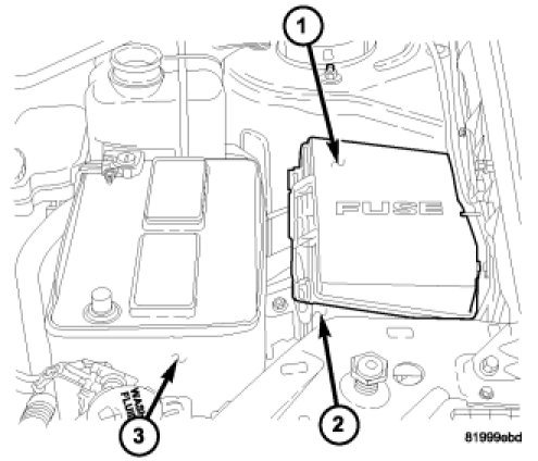 1. Position the A/C compressor clutch relay to the receptacle in the IPM (2) located near the battery (3) in the engine compartment.