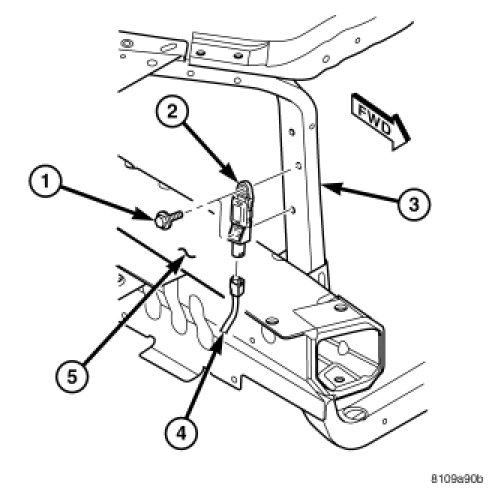3. Through the headlamp opening, install the two mounting screws (1) retaining the front impact sensor (2). Tighten screws to 8.5 Nm (75 in. lbs.).