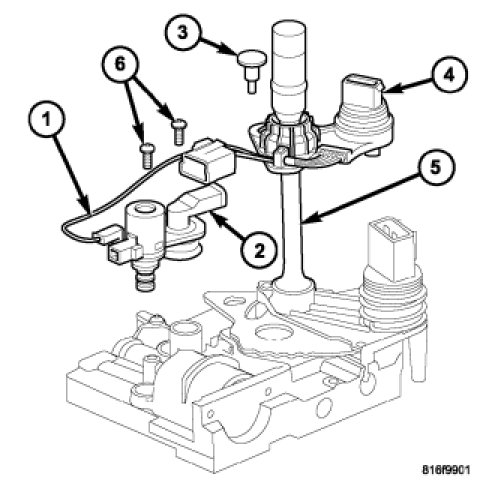 3. Remove the screws (6) holding the pressure control solenoid (1) and line pressure sensor (2) to the valve body.