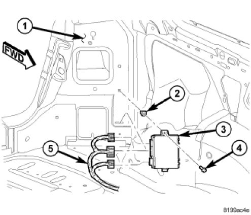 4. Remove the power liftgate control module (3) retaining screw (4).