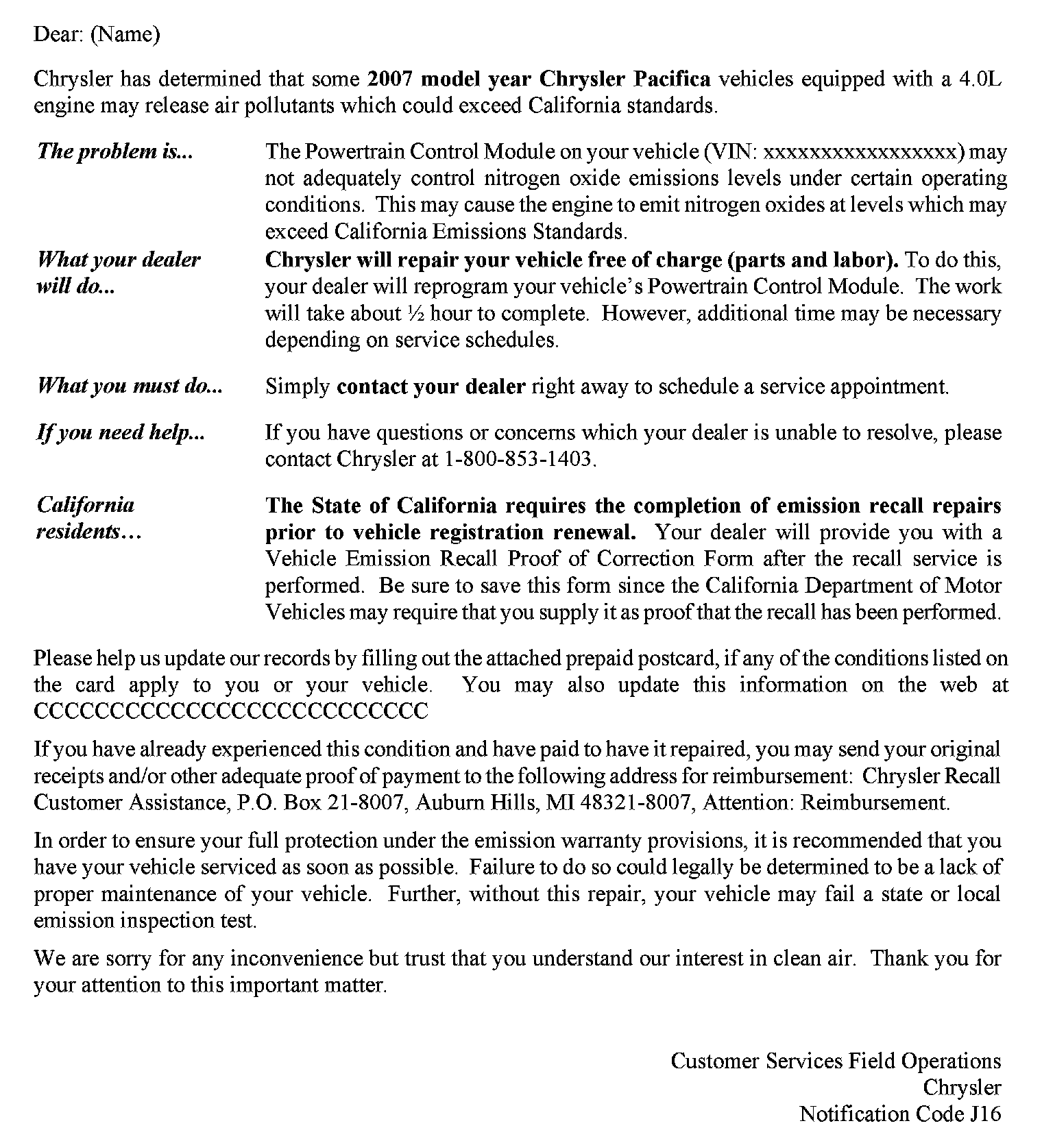 Recall - PCM Software Update For NOX Emissions