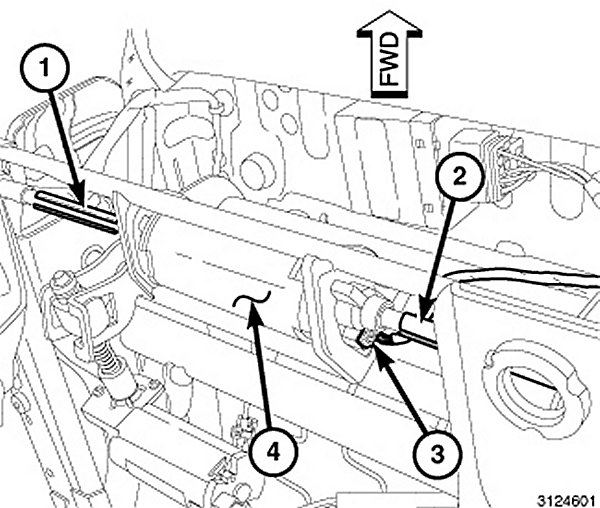 5. Connect the wire harness connector (3) to the fore/aft power seat motor (4).