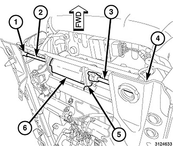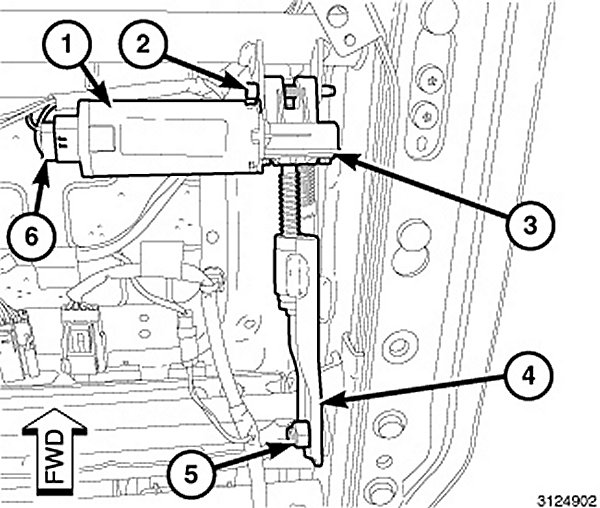2. Install the fore/aft power seat motor (6) and drive cables (2 and 3) as an assembly to the bracket (5).