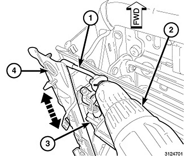 5. Align the left side seat track (4) to the right side seat track using a fore/aft power seat motor flexible drive cable and shaft (1) and a variable speed drill (2).