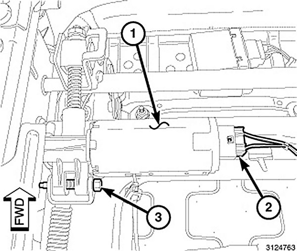 3. Position the front tilt power seat motor (1) to the bracket and install the retaining bolt (3). Tighten the bolt to 5 Nm (44 inch lbs).