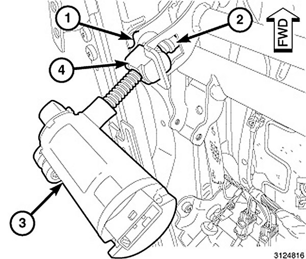 1. Position the front tilt motor (3) so that sleeve (4) can be installed into the seat bracket (1). The motor may need to be rotated counterclockwise so that the worm gear (2) is fully retracted into the sleeve for clearance.