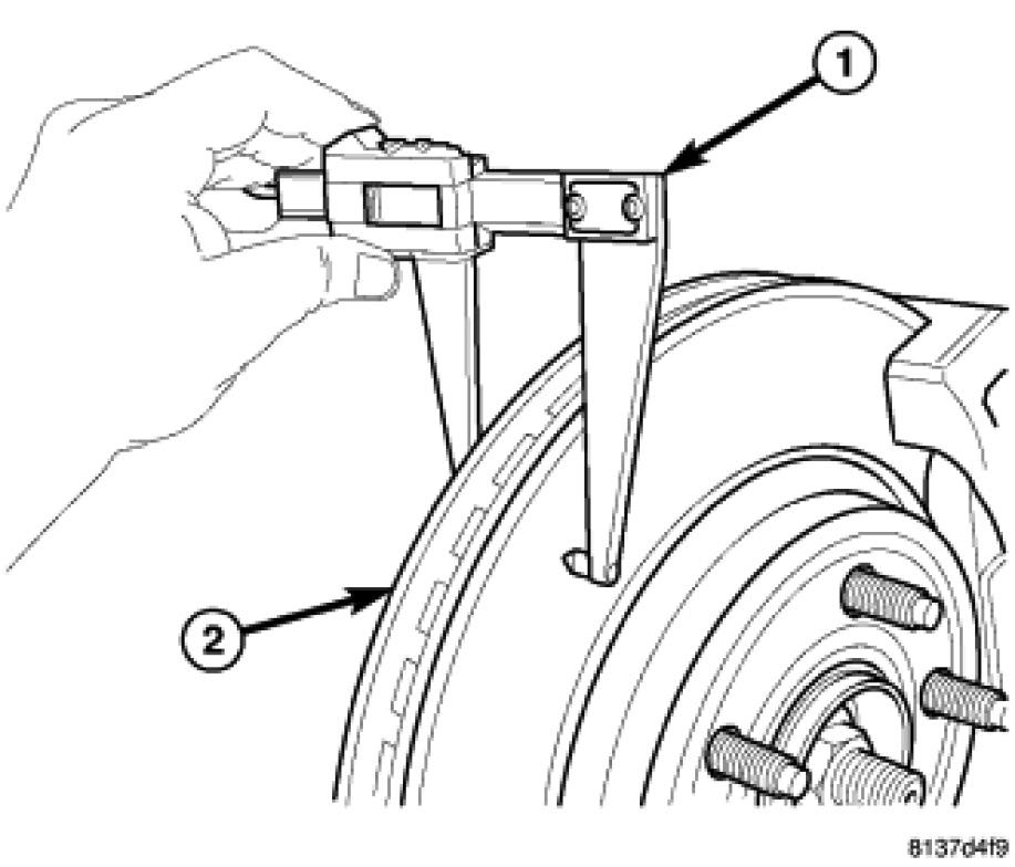 Rotor thickness variation measurements should be made in conjunction with measuring runout. Measure thickness of the brake rotor (2) at 12 equal points around the rotor braking surface with a micrometer (1) at a radius approximately 25 mm (1 inch) from edge of rotor. If thickness measurements vary beyond the specification listed in the specification table, the rotor should be refaced or replaced.