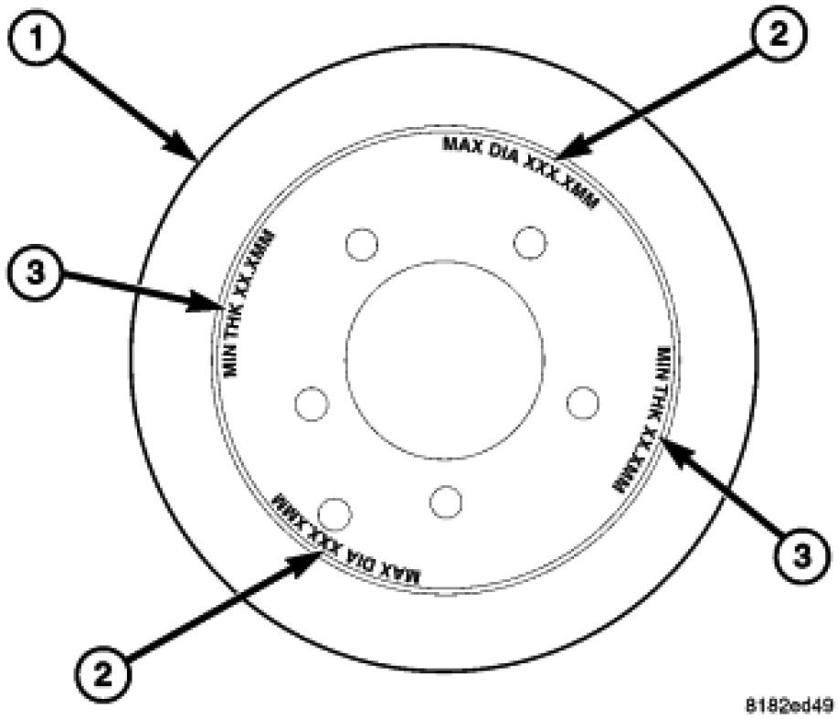 On front rotors, Minimum thickness specifications (2) are cast on the rotor's unmachined surface on the inside of the rotor (1). Limits can also be found in this component's specification table.