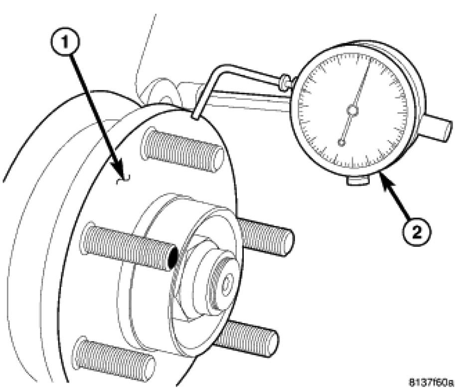 10. Mount Dial Indicator (2), Special Tool C-3339A, to the knuckle. Position the dial indicator stem so it contacts the hub face (1) near the outer diameter. Care must be taken to position the stem outside of the stud circle, but inside of the chamfer on the hub rim.