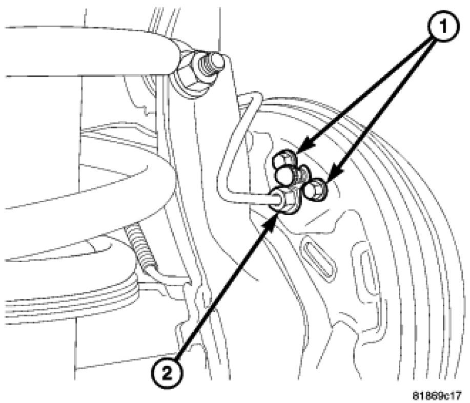 7. Connect the brake tube (2) to the wheel cylinder (1). Tighten the tube nut to 17 Nm (150 in. lbs.).