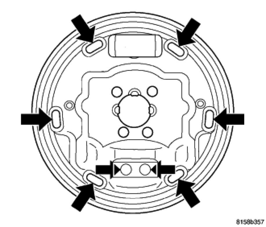 8. Lubricate shoe contact areas on support plate and anchor using Mopar(R) Brake Lubricant or equivalent.