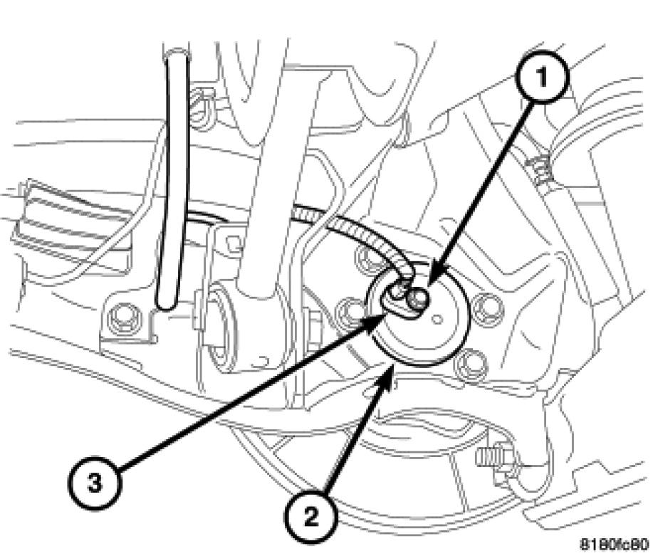 5. If equipped with a wheel speed sensor, Install the wheel speed sensor head (3) into the rear of the hub and bearing (2). Install the wheel speed sensor head mounting screw (1). Tighten the screw to 10 Nm (89 in. lbs.).