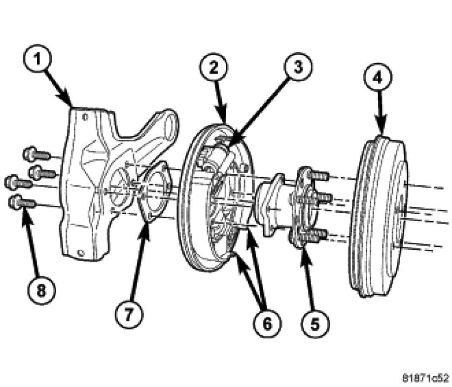 3. Install the four bolts (8) securing the hub and bearing (5), support plate (2), and spacer (7) to the knuckle. Tighten the mounting bolts to 105 Nm (77 ft. lbs.).