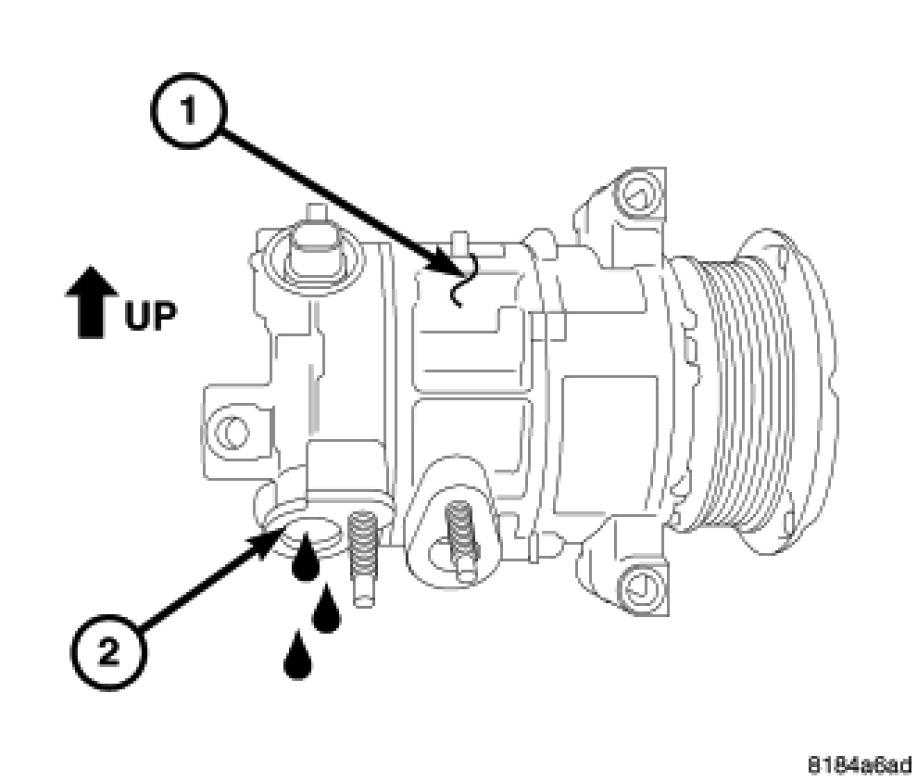2. Position the A/C compressor so that the refrigerant oil can drain out of the suction port (2) into a suitable clean measured container. Hold the A/C compressor in this position until no more oil comes out of the compressor port.