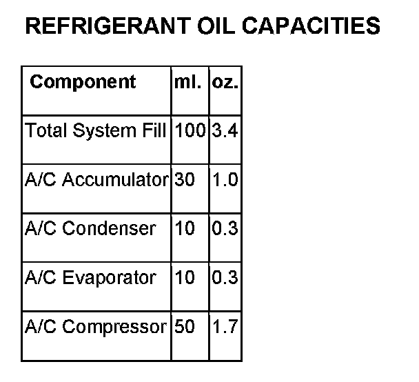 NOTE: When replacing multiple A/C system components, refer to the Refrigerant Oil Capacities chart to determine how much oil should be removed from the new A/C compressor (example: new compressor and accumulator requires 80 ml. (2.7 oz.) of oil to be added to the system. 100 ml. (3.4 oz.) of oil is in new compressor. 100 ml. (3.4 oz.) minus 80 ml. (2.7 oz.) equals 20 ml. (0.7 oz.) oil to be drained from new compressor).