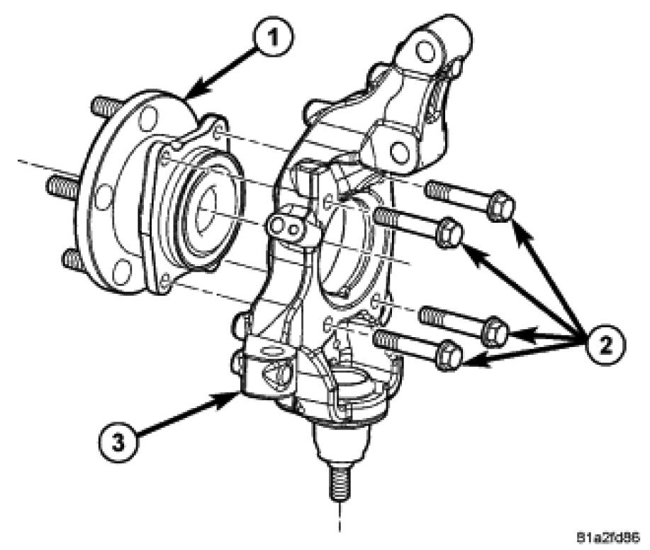 2. Install the four bolts (2) fastening the hub and bearing (1) to the knuckle (3). Tighten the four bolts to 82 Nm (60 ft. lbs.).