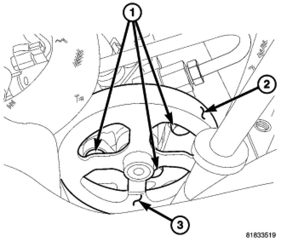 8. Remove the three pump mounting bolts (1) through the pulley (3) openings.