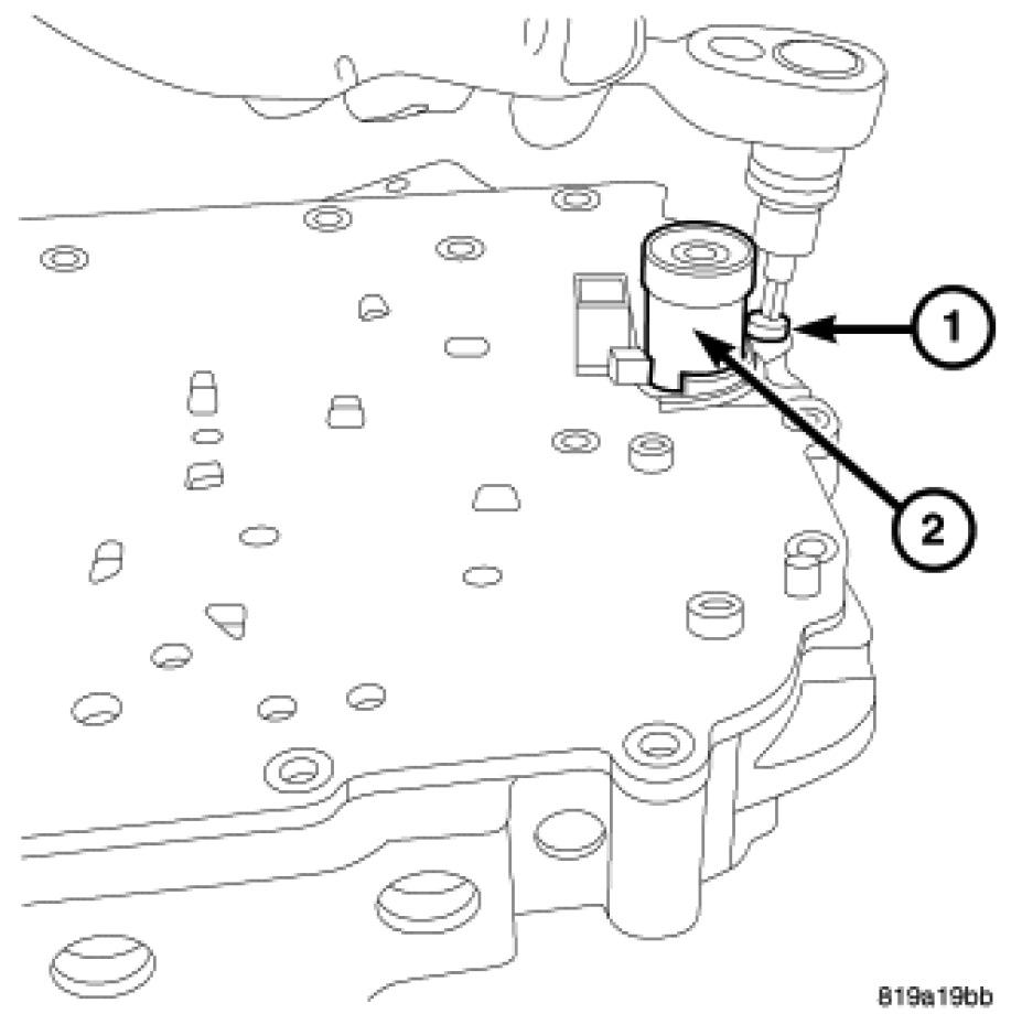6. Remove the bolt (1) at the pressure control solenoid (2).