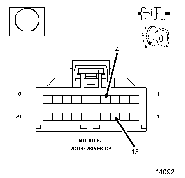 1. Measure the resistance between (Q994) Driver Express Switch Return circuit and the (Q221) Master Switch Left Front Window Mux circuit in the Driver Door Module C2 connector.