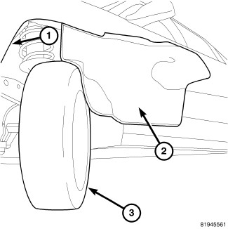 13. Remove the front left side inner wheel splash screws from front side of wheel opening (1) and fold shield (2) back.
