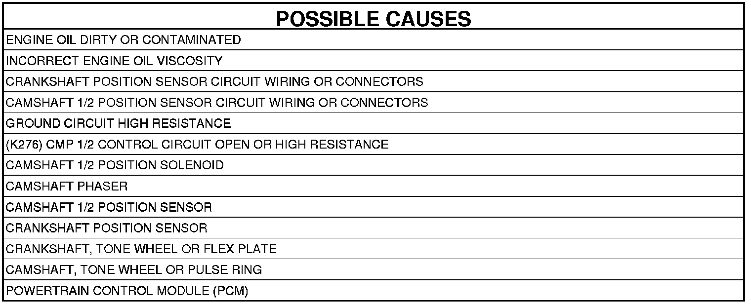 The Powertrain Control Module (PCM) detects that the camshaft position is out of phase with the crankshaft position. One Trip Fault. Three good trips to turn off the MIL.