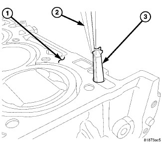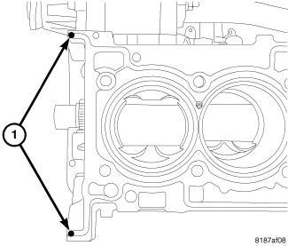 3. Place two pea size dots of Mopar(R) engine sealant RTV or equivalent (1) on cylinder block as shown.