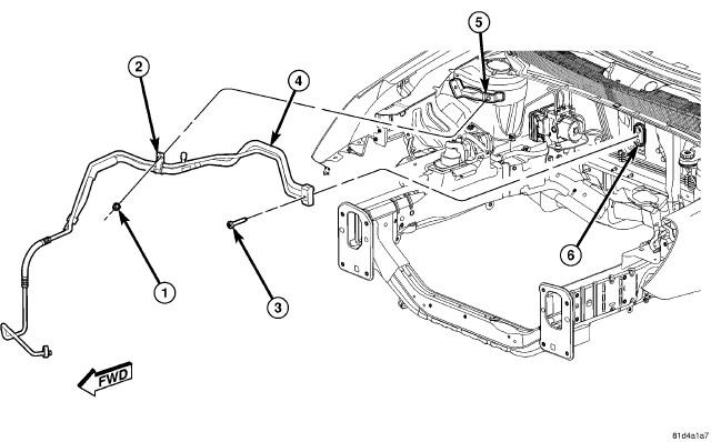 1. Position the A/C liquid and suction line assembly (4) into the engine compartment.