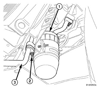 14. Reach up through the opening in the bottom of the front fascia and connect the A/C liquid line (1) to the A/C condenser (2) and install the retaining nut (3). Tighten the nut to 25 Nm (18 ft. lbs.).