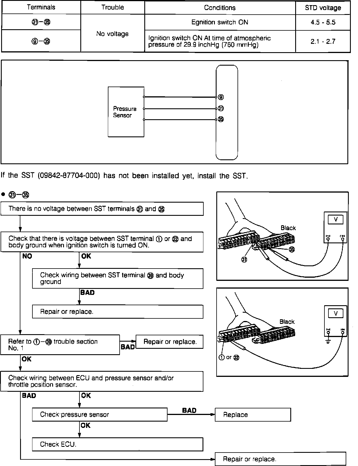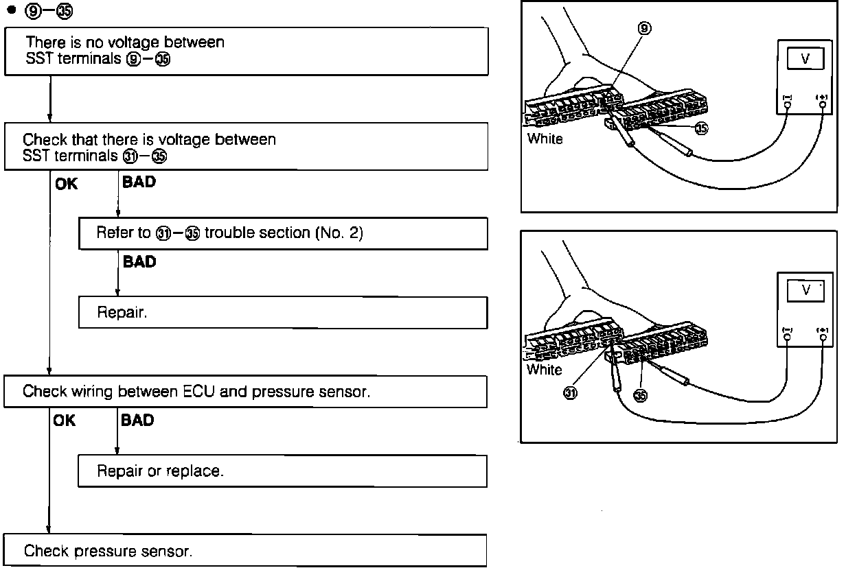 e. If voltage between terminals 31 and 29 is not 4.5-5.5 volts, check wiring between ECU and pressure sensor.