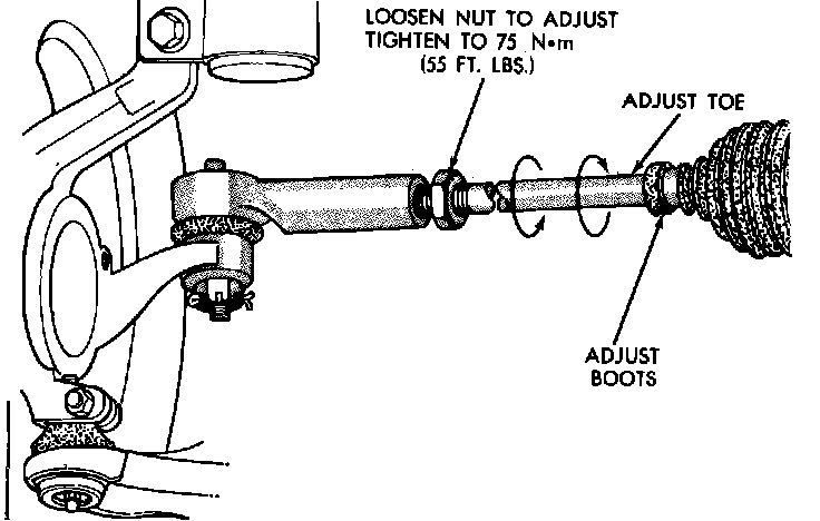To adjust toe-in, center steering wheel and hold in position with a suitable tool. Loosen tie rod locknuts and rotate rod, to adjust toe-in to specifications. Use care not to twist steering gear rubber boots. Torque tie rod locknuts to 55 ft. lbs. (75 Nm). Adjust position of steering gear rubber boots. Remove steering wheel holding tool.