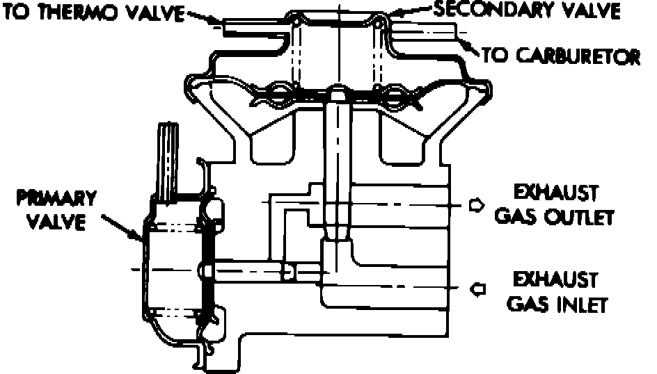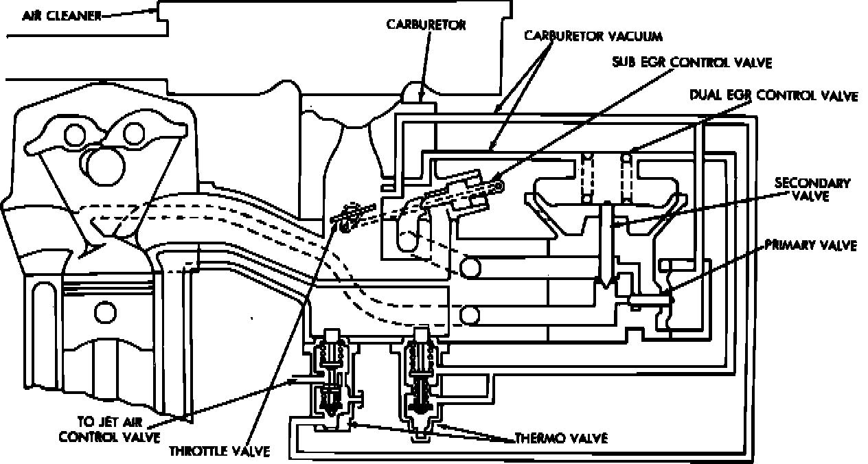 The dual EGR control valve, Fig. 42, used on 4-156 engines consists of primary and secondary valves. These valves are controlled by different carburetor vacuums in response to throttle valve openings, while the EGR flow is suspended at idle and wide open throttle operation. The primary valve controls EGR flow during part throttle operation, while the secondary valve allows recirculation of exhaust gas into the intake manifold when the throttle valve is further opened.